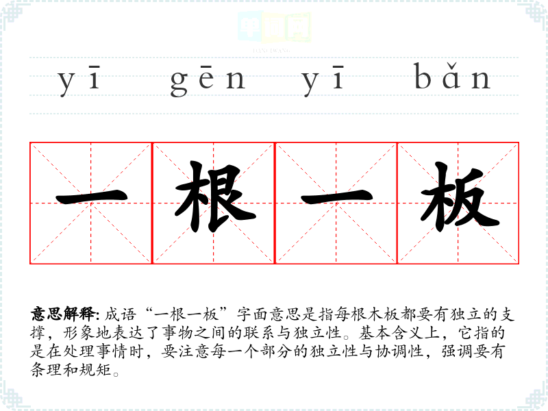 成语“一根一板”字面意思是指每根木板都要有独立的支撑,形象地表达了事物之间的联系与独立性。基本含义上,它指的是在处理事情时,要注意每一个部分的独立性与协调性,强调要有条理和规矩。