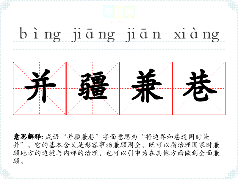 成语“并疆兼巷”字面意思为“将边界和巷道同时兼并”。它的基本含义是形容事物兼顾周全,既可以指治理国家时兼顾地方的边境与内部的治理,也可以引申为在其他方面做到全面兼顾。