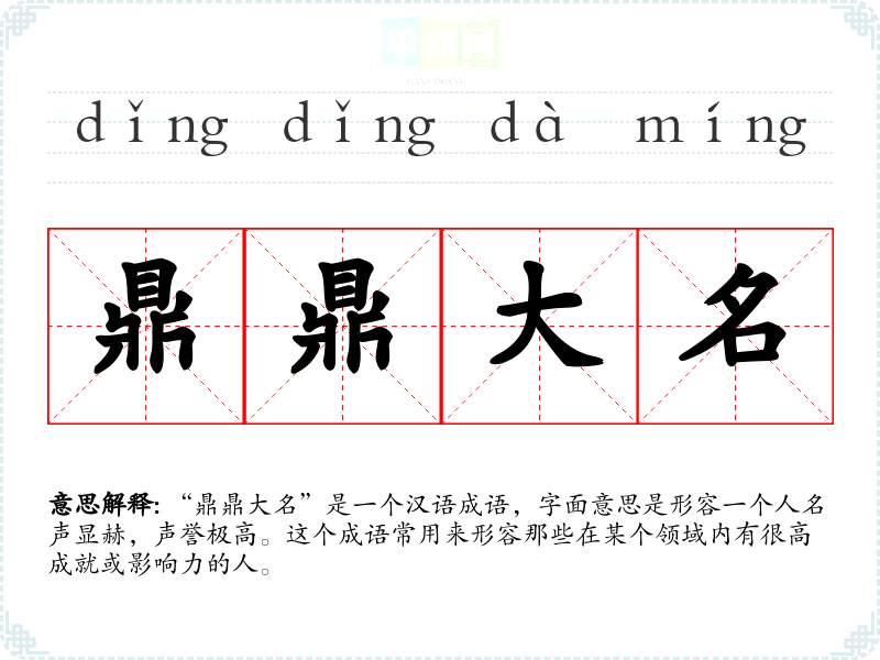 “鼎鼎大名”是一个汉语成语,字面意思是形容一个人名声显赫,声誉极高。这个成语常用来形容那些在某个领域内有很高成就或影响力的人。