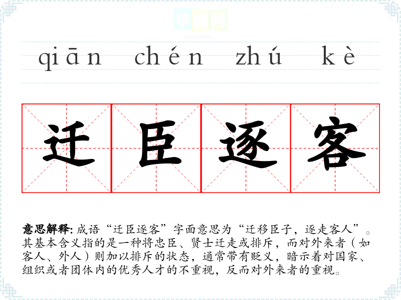 成语“迁臣逐客”字面意思为“迁移臣子,逐走客人”。其基本含义指的是一种将忠臣、贤士迁走或排斥,而对外来者(如客人、外人)则加以排斥的状态,通常带有贬义,暗示着对国家、组织或者团体内的优秀人才的不重视,反而对外来者的重视。