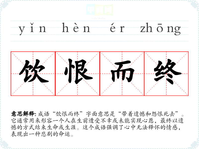 成语“饮恨而终”字面意思是“带着遗憾和怨恨死去”。它通常用来形容一个人在生前遭受不幸或未能实现心愿,最终以遗憾的方式结束生命或生涯。这个成语强调了心中无法释怀的情感,表现出一种悲剧的命运。
