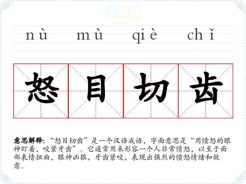 该成语的来源并没有明确的文献记载,但从字面构成来看,“怒目”指愤怒时的目光,“切齿”则形容愤怒时咬紧牙齿的状态。可以推测,这个成语是通过描述愤怒时的身体表现而逐渐形成的,常见于古典文学中对愤怒和情绪的描写。