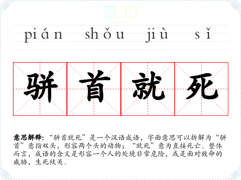 “骈首就死”是一个汉语成语,字面意思可以拆解为“骈首”意指双头,形容两个头的动物;“就死”意为直接死亡。整体而言,成语的含义是形容一个人的处境非常危险,或是面对致命的威胁,生死攸关。