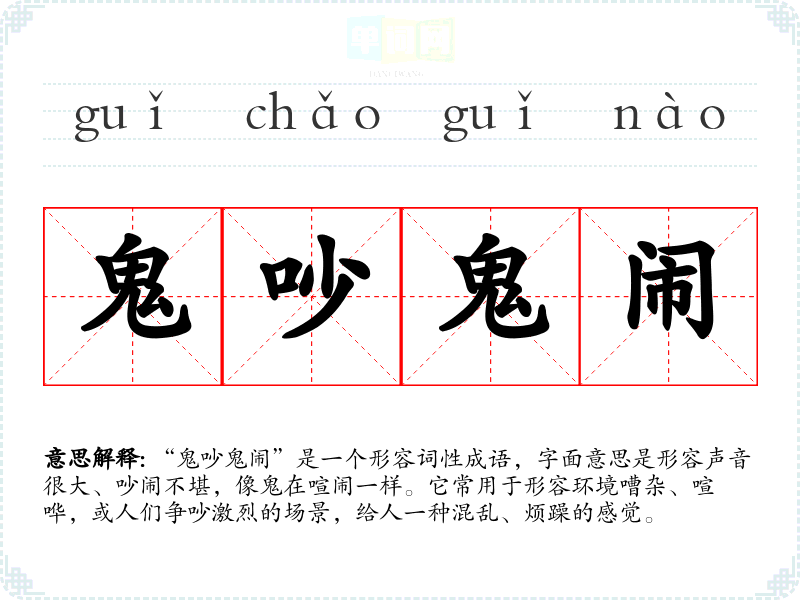 “鬼吵鬼闹”是一个形容词性成语,字面意思是形容声音很大、吵闹不堪,像鬼在喧闹一样。它常用于形容环境嘈杂、喧哗,或人们争吵激烈的场景,给人一种混乱、烦躁的感觉。