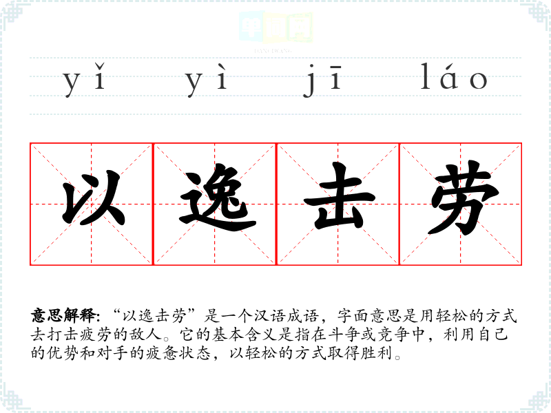 | 以逸待劳 | 逸:安闲;劳:疲劳。指在战争中做好充分准备,养精蓄锐,等疲乏的敌人来犯时给以迎头痛击。 |