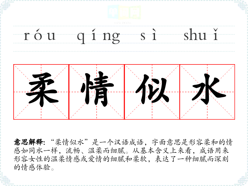“柔情似水”是一个汉语成语,字面意思是形容柔和的情感如同水一样,流畅、温柔而细腻。从基本含义上来看,成语用来形容女性的温柔情感或爱情的细腻和柔软,表达了一种细腻而深刻的情感体验。