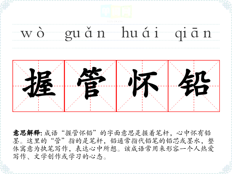 成语“握管怀铅”的字面意思是握着笔杆,心中怀有铅墨。这里的“管”指的是笔杆,铅通常指代铅笔的铅芯或墨水,整体寓意为执笔写作,表达心中所想。该成语常用来形容一个人热爱写作、文学创作或学*的心态。