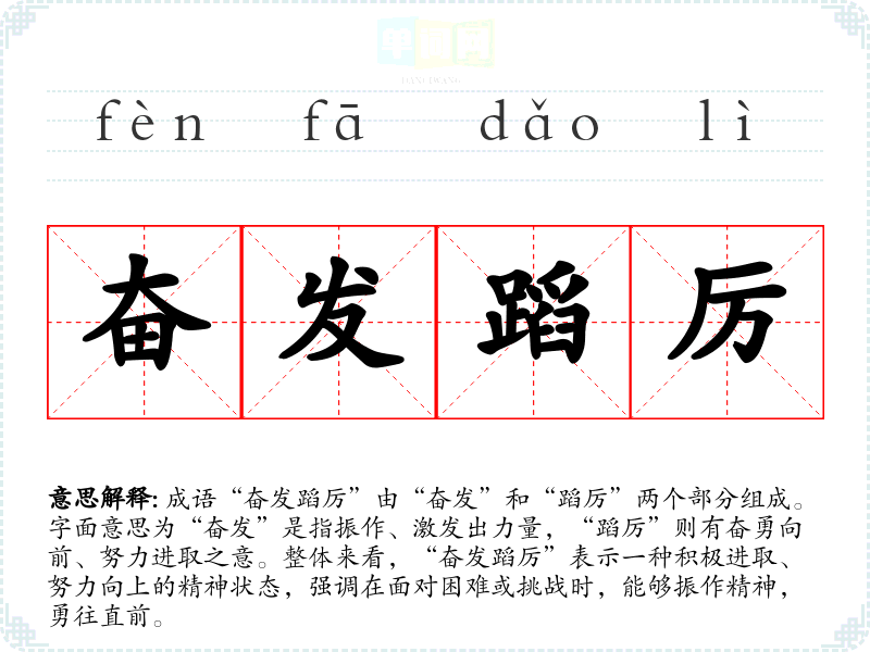 成语“奋发蹈厉”由“奋发”和“蹈厉”两个部分组成。字面意思为“奋发”是指振作、激发出力量,“蹈厉”则有奋勇向前、努力进取之意。整体来看,“奋发蹈厉”表示一种积极进取、努力向上的精神状态,强调在面对困难或挑战时,能够振作精神,勇往直前。