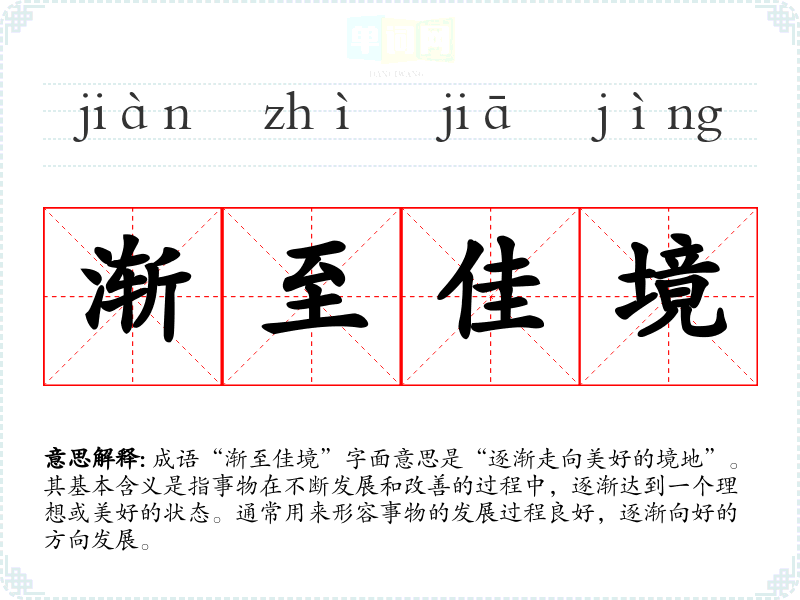 成语“渐至佳境”字面意思是“逐渐走向美好的境地”。其基本含义是指事物在不断发展和改善的过程中,逐渐达到一个理想或美好的状态。通常用来形容事物的发展过程良好,逐渐向好的方向发展。
