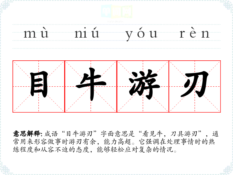 成语“目牛游刃”字面意思是“看见牛,刀具游刃”,通常用来形容做事时游刃有余,能力高超。它强调在处理事情时的熟练程度和从容不迫的态度,能够轻松应对复杂的情况。
