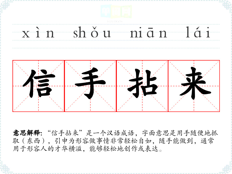 “信手拈来”是一个汉语成语,字面意思是用手随便地抓取(东西),引申为形容做事情非常轻松自如,随手能做到,通常用于形容人的才华横溢,能够轻松地创作或表达。