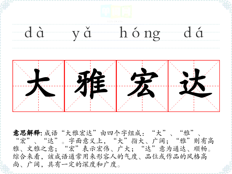 成语“大雅宏达”由四个字组成:“大”、“雅”、“宏”、“达”。字面意义上,“大”指大、广阔;“雅”则有高雅、文雅之意;“宏”表示宏伟、广大;“达”意为通达、顺畅。综合来看,该成语通常用来形容人的气度、品位或作品的风格高尚、广阔,具有一定的深度和广度。