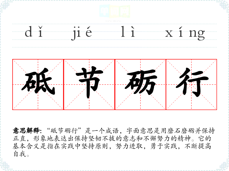 “砥节砺行”是一个成语,字面意思是用磨石磨砺并保持正直,形象地表达出保持坚韧不拔的意志和不懈努力的精神。它的基本含义是指在实践中坚持原则,努力进取,勇于实践,不断提高自我。