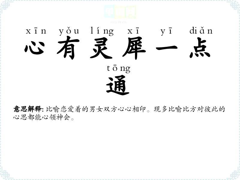 | 心有灵犀一点通 | 比喻恋爱着的男女双方心心相印。现多比喻比方对彼此的心思都能心领神会。 |
