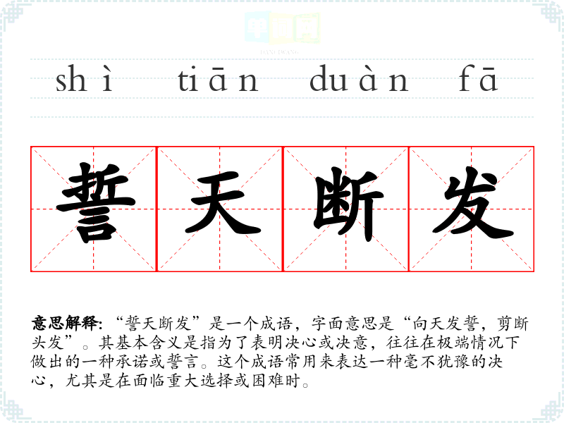 通过对“誓天断发”的学,我体会到,该成语不仅在语言表达中具有重要性,更在生活中提醒我们做出坚定的决策和承诺。在学语言的过程中,理解和运用这样的成语,能够丰富我们的表达,使之更加生动和有力。