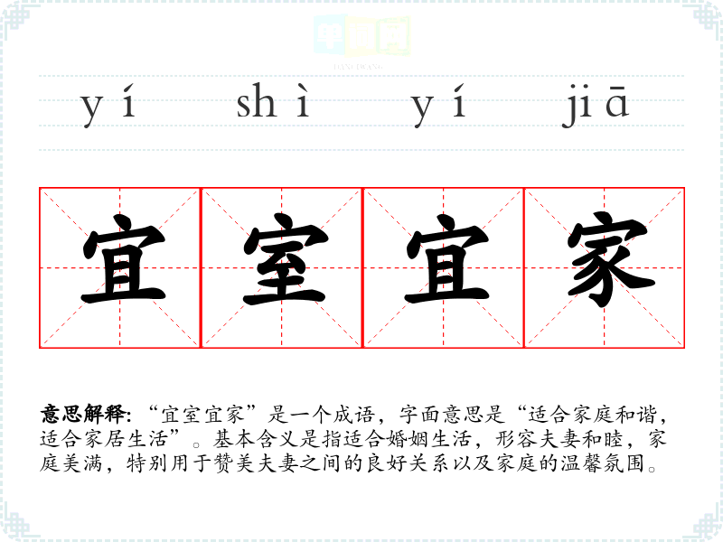 “宜室宜家”是一个成语,字面意思是“适合家庭和谐,适合家居生活”。基本含义是指适合婚姻生活,形容夫妻和睦,家庭美满,特别用于赞美夫妻之间的良好关系以及家庭的温馨氛围。