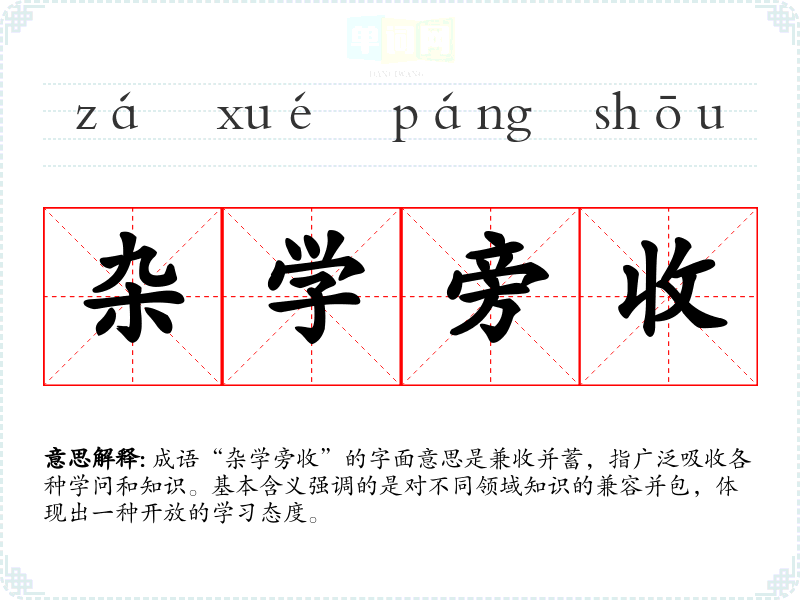 | 杂学旁收 | 杂:多种多样的;旁:广泛。广泛地学习,多方面地积累知识。 |