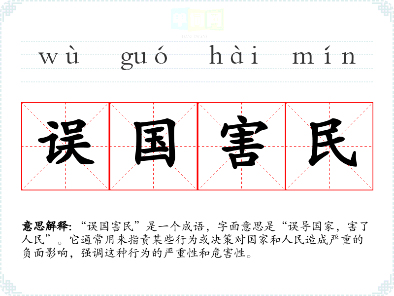 | 误国害民 | 给国家人民带来祸害。同“误国殃民。” |