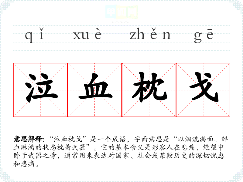 “泣血枕戈”是一个成语,字面意思是“以泪流满面、鲜血淋漓的状态枕着武器”。它的基本含义是形容人在悲痛、绝望中卧于武器之旁,通常用来表达对国家、社会或某段历史的深切忧虑和悲痛。