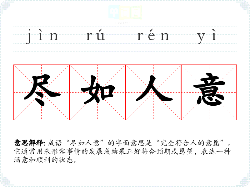 成语“尽如人意”的字面意思是“完全符合人的意愿”。它通常用来形容事情的发展或结果正好符合预期或愿望,表达一种满意和顺利的状态。