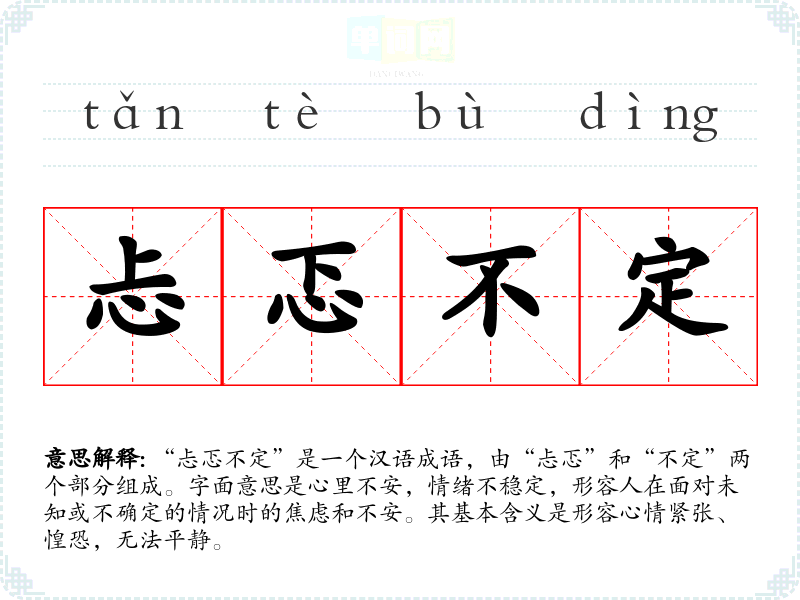 “忐忑不定”是一个汉语成语,由“忐忑”和“不定”两个部分组成。字面意思是心里不安,情绪不稳定,形容人在面对未知或不确定的情况时的焦虑和不安。其基本含义是形容心情紧张、惶恐,无法平静。