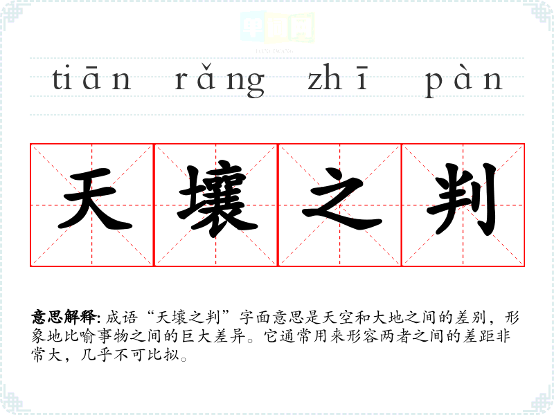 | 天壤之判 | 壤:地。天和地,一极在上,一级在下,比喻差别极大。 |