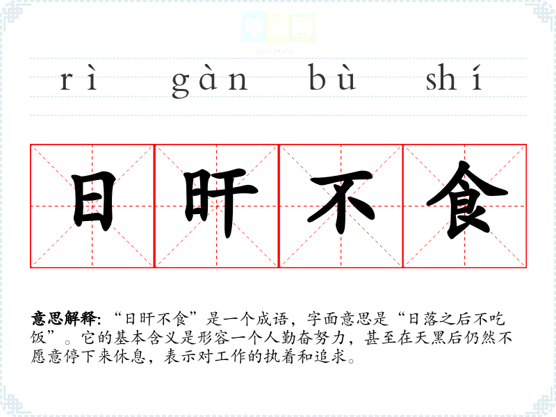 “日旰不食”是一个成语,字面意思是“日落之后不吃饭”。它的基本含义是形容一个人勤奋努力,甚至在天黑后仍然不愿意停下来休息,表示对工作的执着和追求。