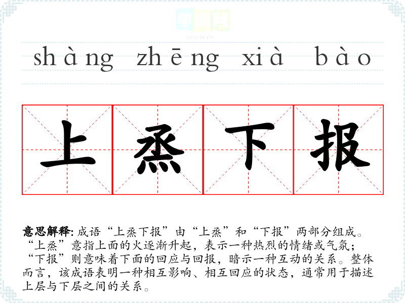 成语“上烝下报”由“上烝”和“下报”两部分组成。“上烝”意指上面的火逐渐升起,表示一种热烈的情绪或气氛;“下报”则意味着下面的回应与回报,暗示一种互动的关系。整体而言,该成语表明一种相互影响、相互回应的状态,通常用于描述上层与下层之间的关系。