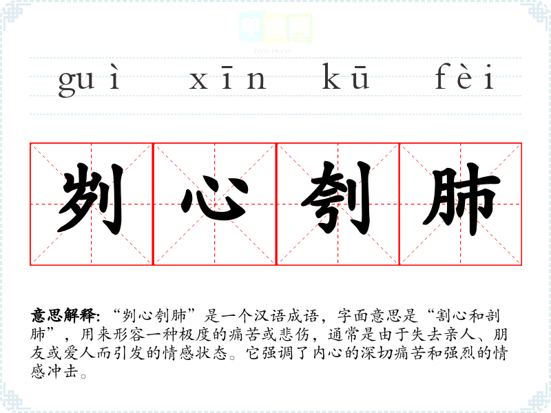 “刿心刳肺”是一个汉语成语,字面意思是“割心和剖肺”,用来形容一种极度的痛苦或悲伤,通常是由于失去亲人、朋友或爱人而引发的情感状态。它强调了内心的深切痛苦和强烈的情感冲击。