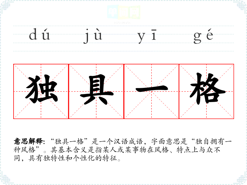 “独具一格”是一个汉语成语,字面意思是“独自拥有一种风格”。其基本含义是指某人或某事物在风格、特点上与众不同,具有独特性和个性化的特征。