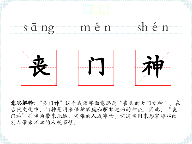 “丧门神”这个成语字面意思是“丧失的大门之神”。在古代文化中,门神是用来保护家庭和驱邪避凶的神祇。因此,“丧门神”引申为带来厄运、灾难的人或事物。它通常用来形容那些给别人带来不幸的人或事情。