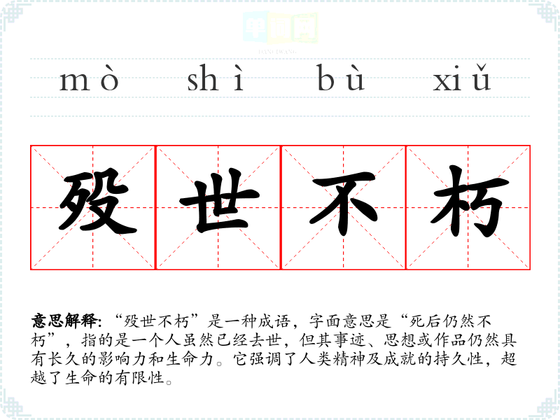 “殁世不朽”是一种成语,字面意思是“死后仍然不朽”,指的是一个人虽然已经去世,但其事迹、思想或作品仍然具有长久的影响力和生命力。它强调了人类精神及成就的持久性,超越了生命的有限性。