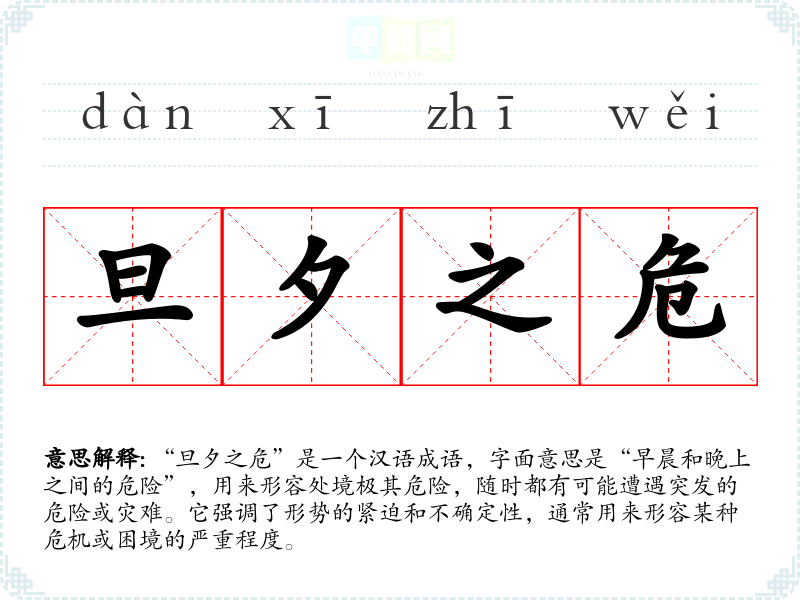 “旦夕之危”是一个汉语成语,字面意思是“早晨和晚上之间的危险”,用来形容处境极其危险,随时都有可能遭遇突发的危险或灾难。它强调了形势的紧迫和不确定性,通常用来形容某种危机或困境的严重程度。