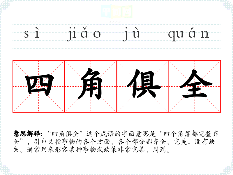 “四角俱全”这个成语的字面意思是“四个角落都完整齐全”,引申义指事物的各个方面、各个部分都齐全、完美,没有缺失。通常用来形容某种事物或政策非常完善、周到。
