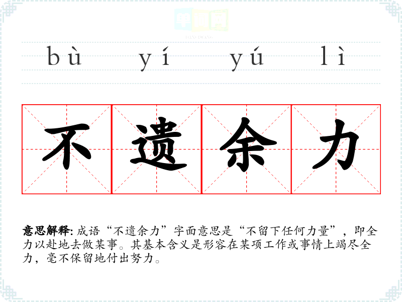 成语“不遗余力”字面意思是“不留下任何力量”,即全力以赴地去做某事。其基本含义是形容在某项工作或事情上竭尽全力,毫不保留地付出努力。