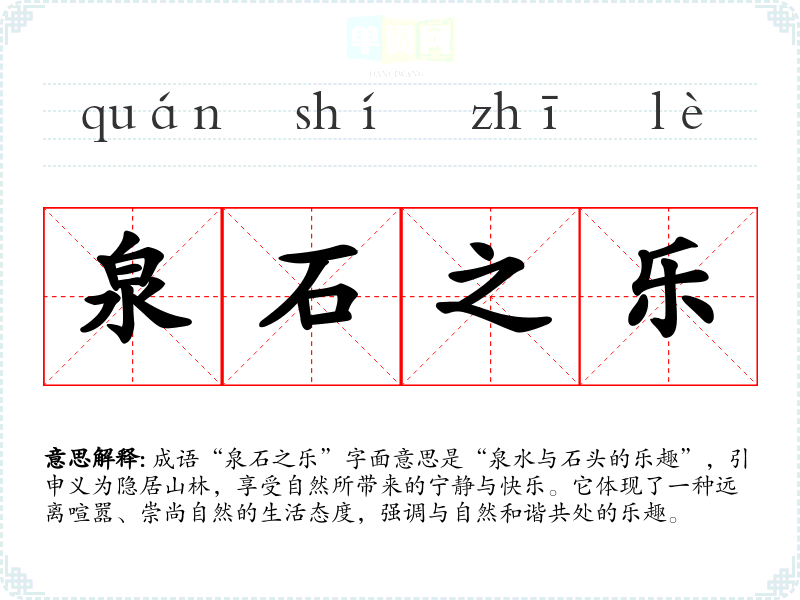 成语“泉石之乐”字面意思是“泉水与石头的乐趣”,引申义为隐居山林,享受自然所带来的宁静与快乐。它体现了一种远离喧嚣、崇尚自然的生活态度,强调与自然和谐共处的乐趣。