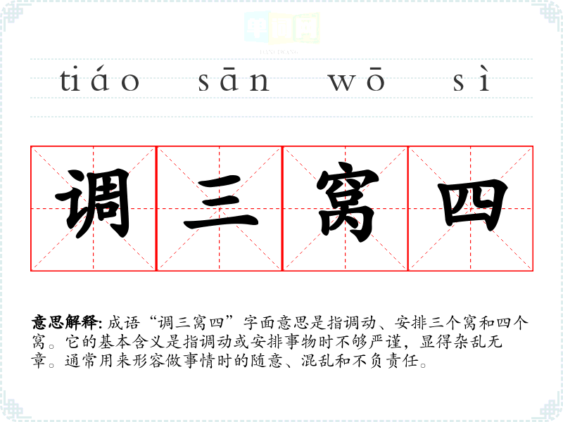 成语“调三窝四”字面意思是指调动、安排三个窝和四个窝。它的基本含义是指调动或安排事物时不够严谨,显得杂乱无章。通常用来形容做事情时的随意、混乱和不负责任。