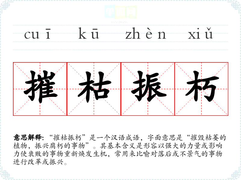 “摧枯振朽”是一个汉语成语,字面意思是“摧毁枯萎的植物,振兴腐朽的事物”。其基本含义是形容以强大的力量或影响力使衰败的事物重新焕发生机,常用来比喻对落后或不景气的事物进行改革或振兴。