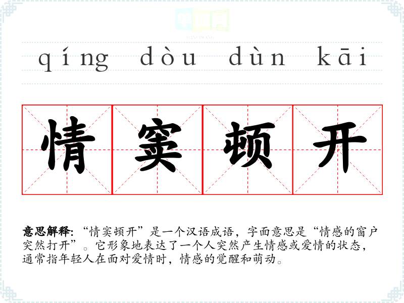 | 情窦顿开 | 窦:孔穴;情窦:情意的发生或男女爱情萌动。指少男少女刚开始懂得爱情。 |