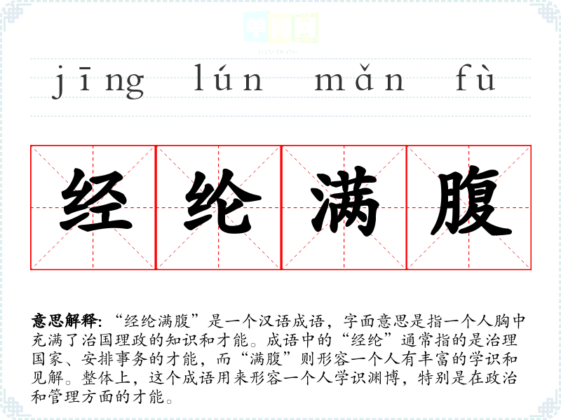 在英语中,类似表达可以是“knowledgeable”或“well-versed”,但这些表达并没有完全涵盖“经纶”特有的治国理政的内涵。许多文化中都有强调知识和智慧的成语或表达,但其具体含义和文化背景可能会有所不同。