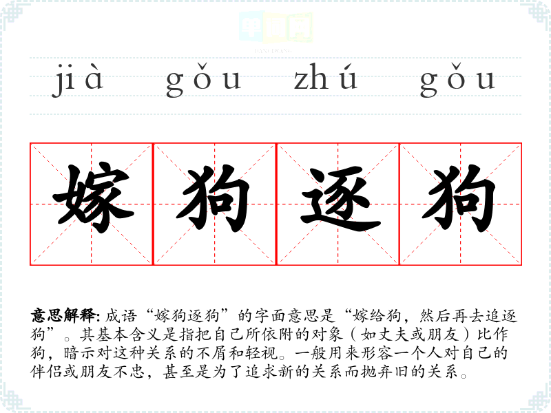 成语“嫁狗逐狗”的字面意思是“嫁给狗,然后再去追逐狗”。其基本含义是指把自己所依附的对象(如丈夫或朋友)比作狗,暗示对这种关系的不屑和轻视。一般用来形容一个人对自己的伴侣或朋友不忠,甚至是为了追求新的关系而抛弃旧的关系。