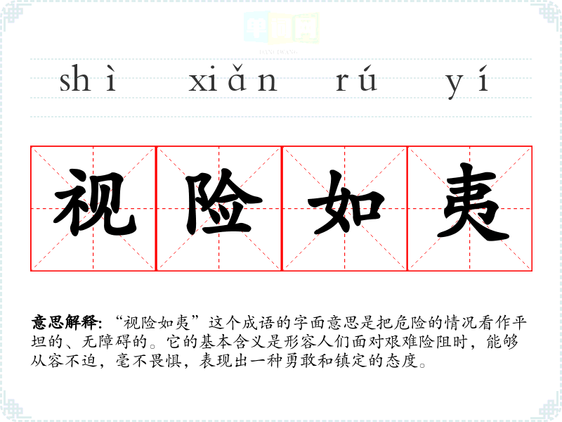 “视险如夷”这个成语的字面意思是把危险的情况看作平坦的、无障碍的。它的基本含义是形容人们面对艰难险阻时,能够从容不迫,毫不畏惧,表现出一种勇敢和镇定的态度。