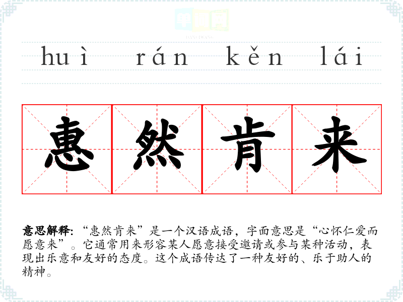 “惠然肯来”是一个汉语成语,字面意思是“心怀仁爱而愿意来”。它通常用来形容某人愿意接受邀请或参与某种活动,表现出乐意和友好的态度。这个成语传达了一种友好的、乐于助人的精神。