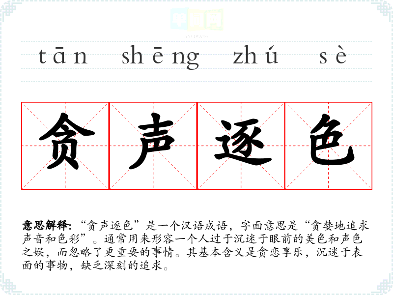 “贪声逐色”是一个汉语成语,字面意思是“贪婪地追求声音和色彩”。通常用来形容一个人过于沉迷于眼前的美色和声色之娱,而忽略了更重要的事情。其基本含义是贪恋享乐,沉迷于表面的事物,缺乏深刻的追求。