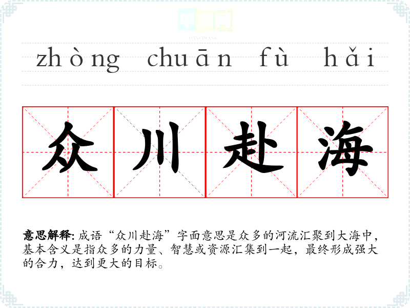 成语“众川赴海”字面意思是众多的河流汇聚到大海中,基本含义是指众多的力量、智慧或资源汇集到一起,最终形成强大的合力,达到更大的目标。