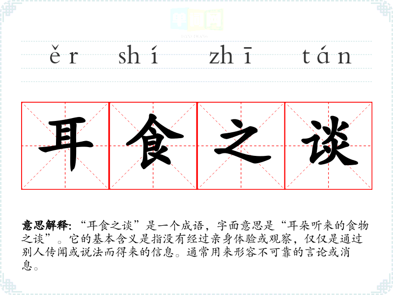 “耳食之谈”是一个成语,字面意思是“耳朵听来的食物之谈”。它的基本含义是指没有经过亲身体验或观察,仅仅是通过别人传闻或说法而得来的信息。通常用来形容不可靠的言论或消息。