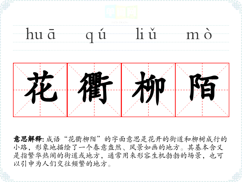 成语“花衢柳陌”的字面意思是花开的街道和柳树成行的小路,形象地描绘了一个春意盎然、风景如画的地方。其基本含义是指繁华热闹的街道或地方,通常用来形容生机勃勃的场景,也可以引申为人们交往频繁的地方。