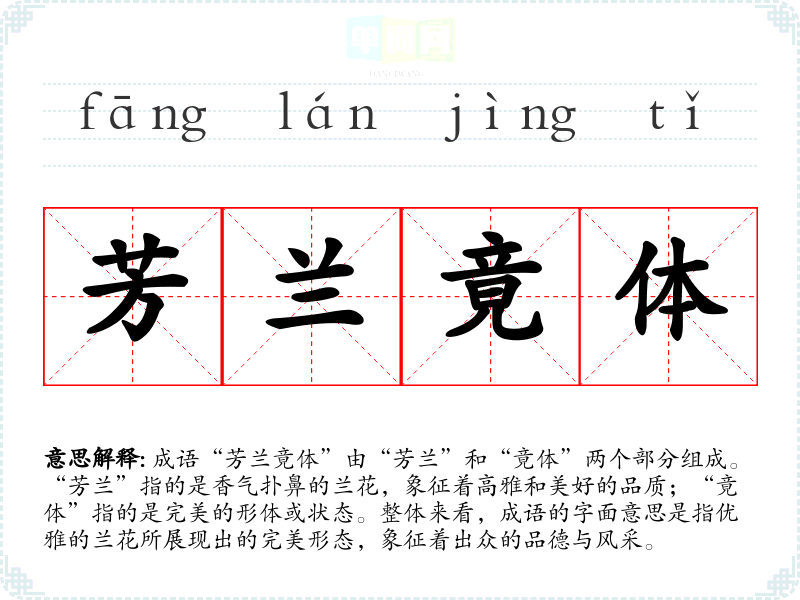 成语“芳兰竟体”由“芳兰”和“竟体”两个部分组成。“芳兰”指的是香气扑鼻的兰花,象征着高雅和美好的品质;“竟体”指的是完美的形体或状态。整体来看,成语的字面意思是指优雅的兰花所展现出的完美形态,象征着出众的品德与风采。