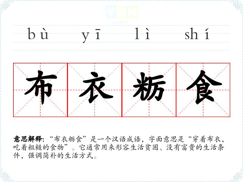 该成语源于古代**,强调了士人或平民的生活状态。在《左传》中有类似的表达,反映了古代社会对平民生活的认知和描述。成语的构成中,“布衣”指普通人或平民的衣服,而“粝食”则指粗糙的米饭或食物,二者结合传达出一种朴素、简朴的生活态度。