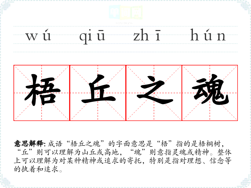 成语“梧丘之魂”的字面意思是“梧”指的是梧桐树,“丘”则可以理解为山丘或高地,“魂”则意指灵魂或精神。整体上可以理解为对某种精神或追求的寄托,特别是指对理想、信念等的执着和追求。